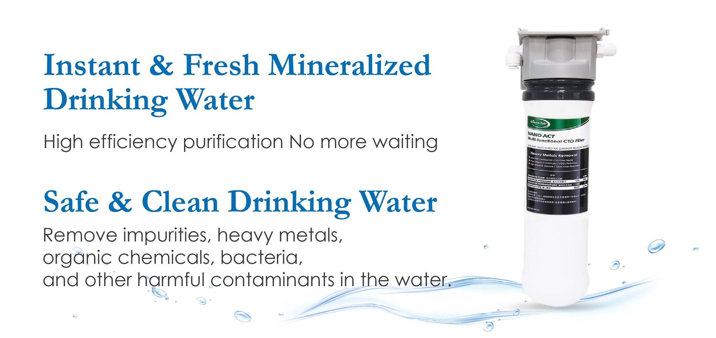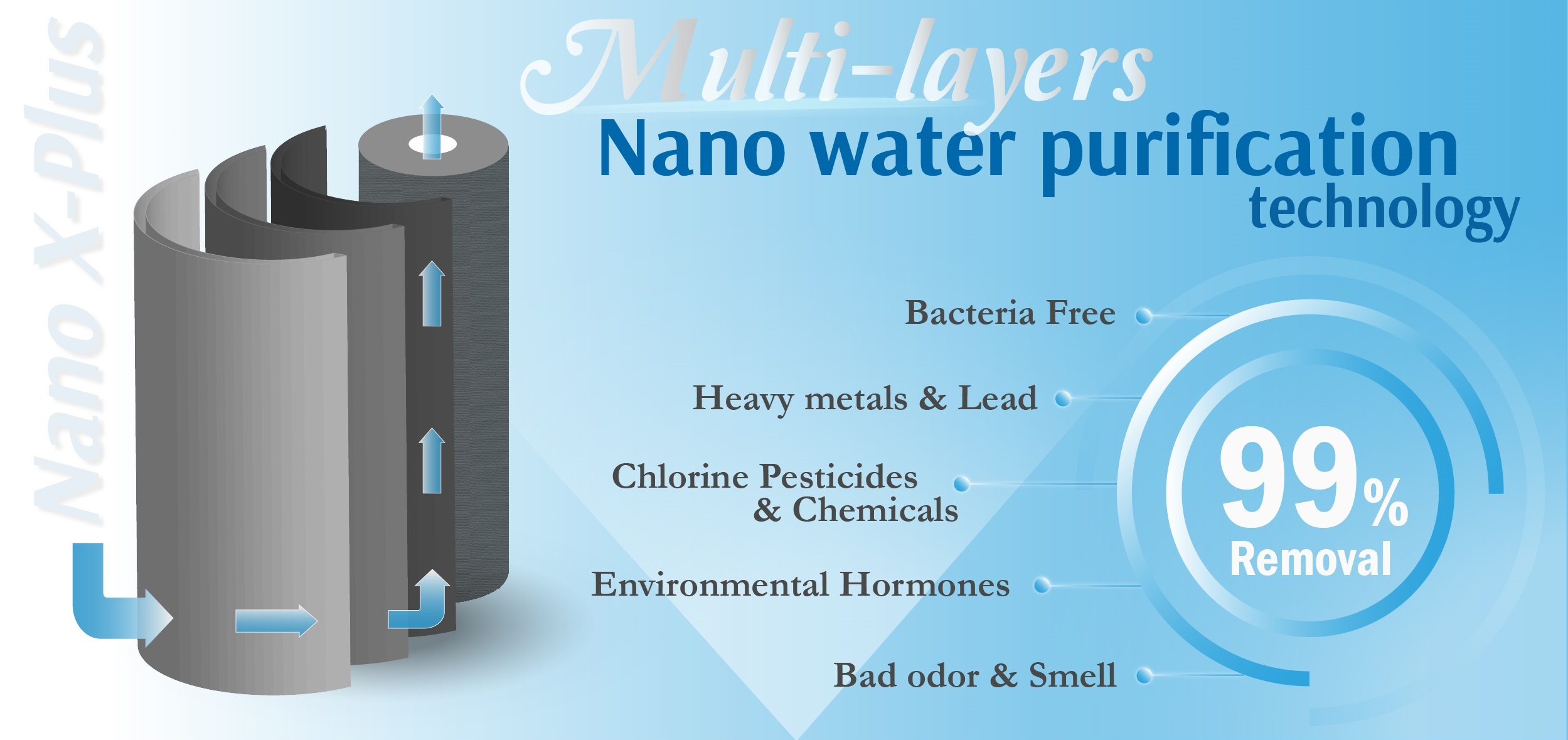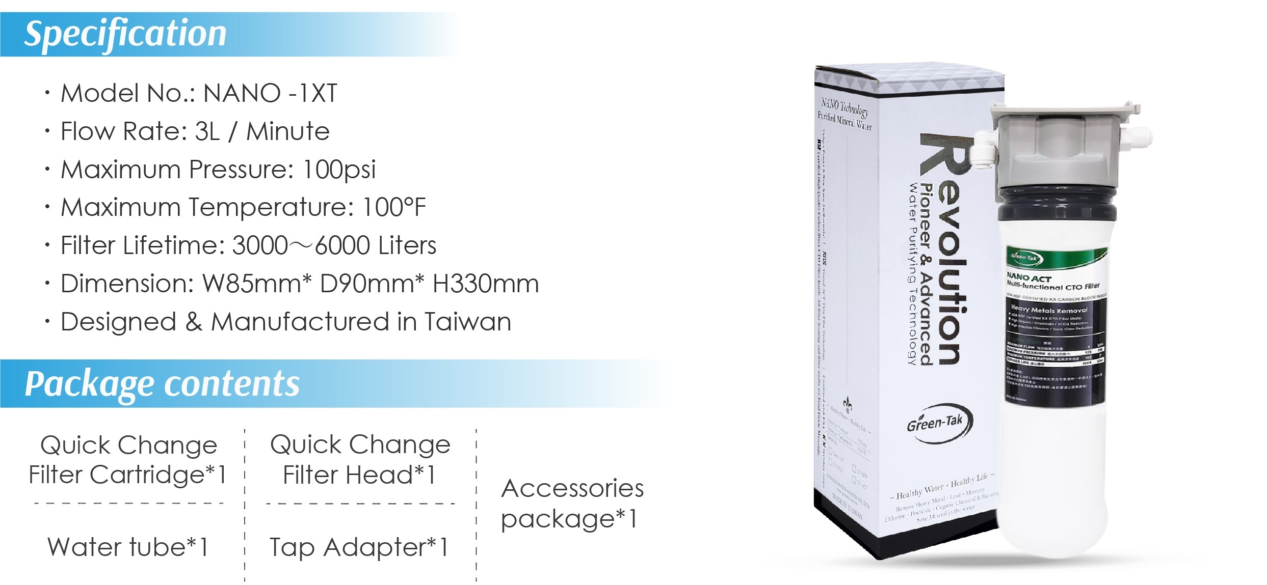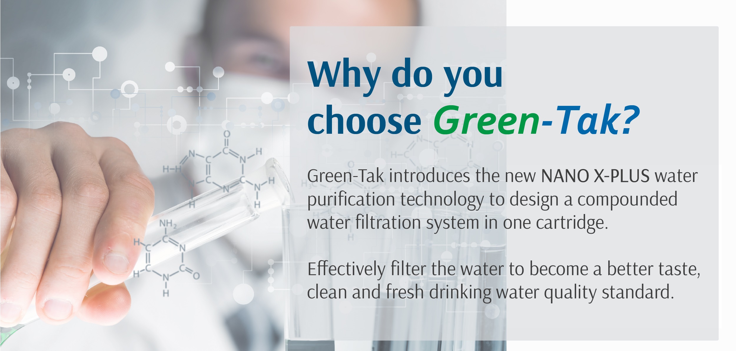 Green-Tak introduces new nano x-plus water purification technology to design a quick change portable NANO-ACT Water Purification effectively filter the water to become a better and fresh drinking water quality standard. NANO-ACT Water Purification can remove 99% of bacteria, heavy metals and chlorine from water and keep minerals in the filtered water.